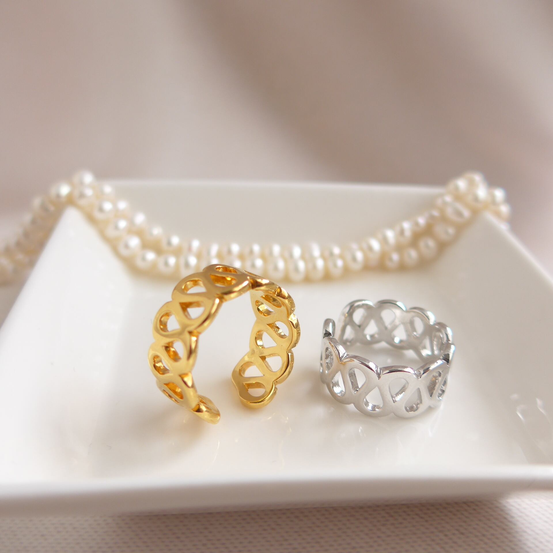 太めのシルエットながらレース調のデザインが女性らしく、華奢なリングやストーン付きのリングとの相性は抜群◎