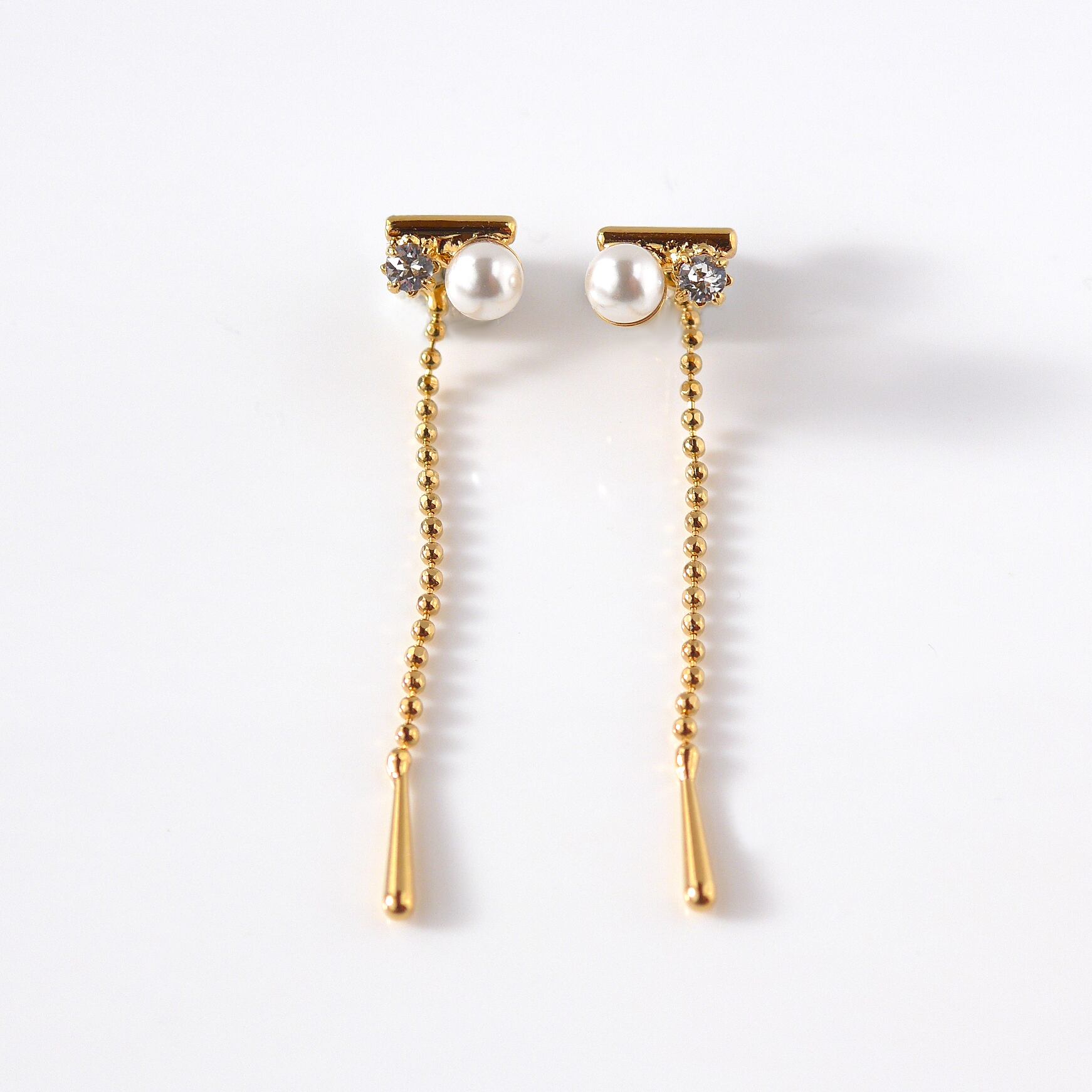 5ミリのクリスタルパールを使ったシンプルなトップに、華奢なチェーンが揺れるデザインです。