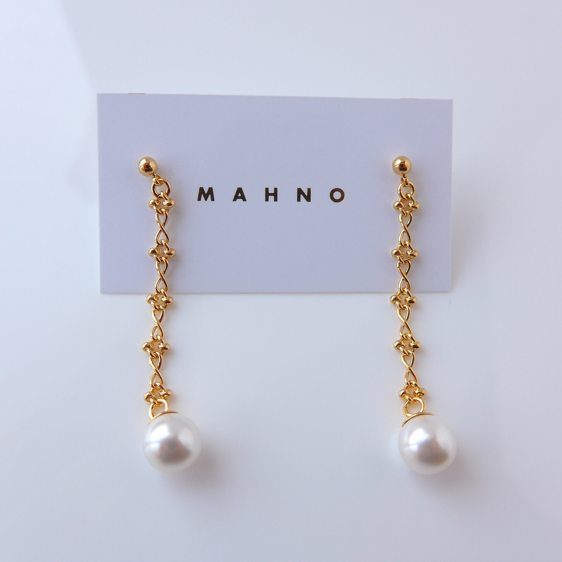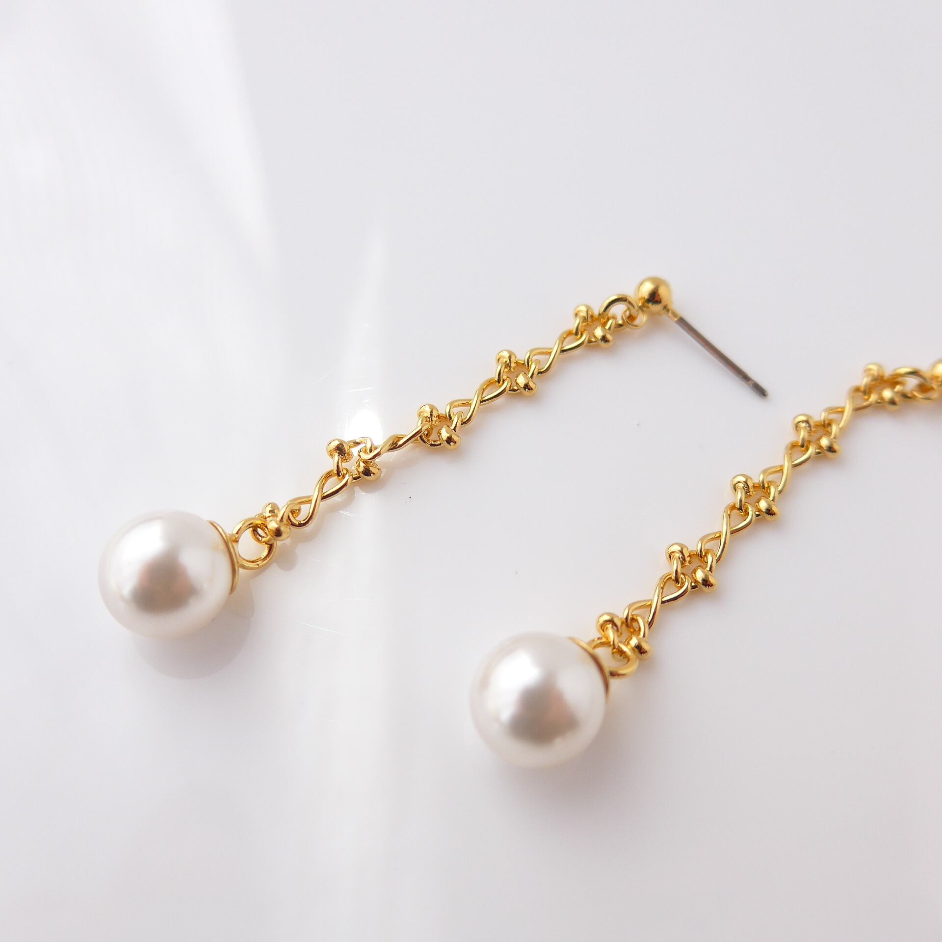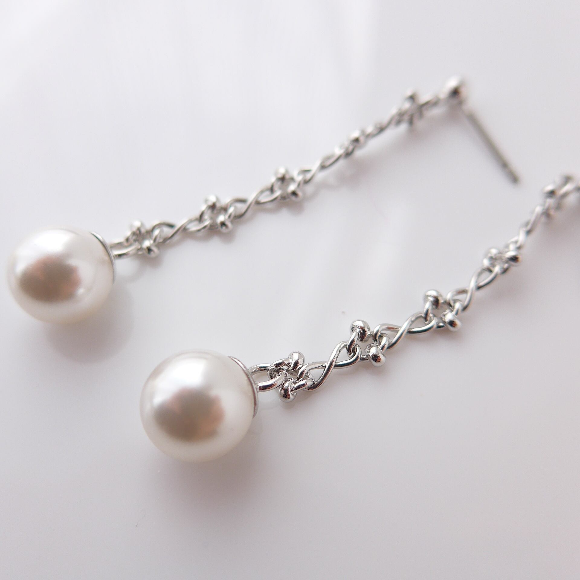 レースをモチーフにしたアンティーク調のチェーンが素敵なパールのピアス/イヤリングです。